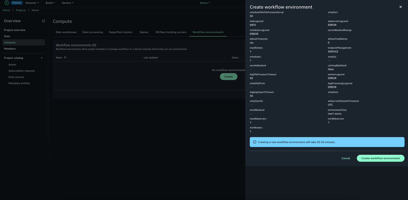 - In your SageMaker Unified Studio project, navigate to the Compute section and select Workflow environment.