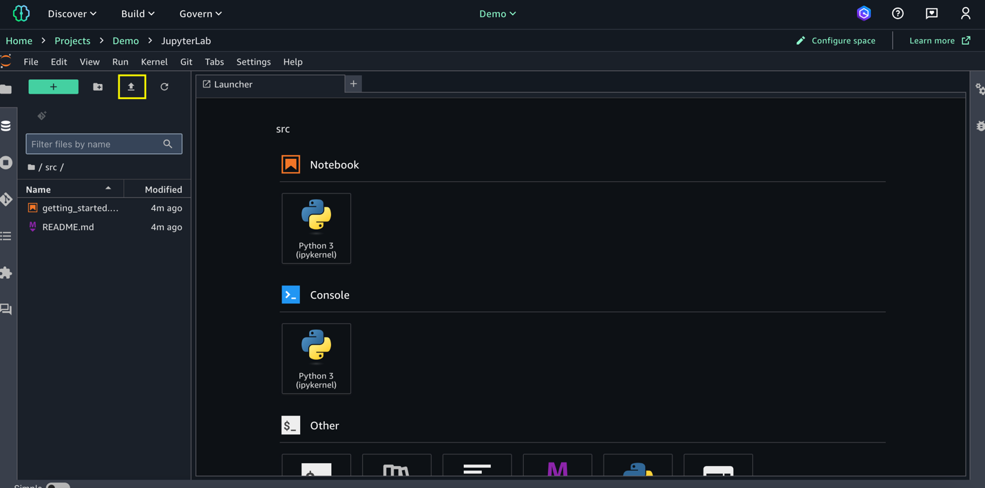 - Go to Build and select JupyterLab; choose Upload files and import the three notebooks you downloaded in the previous step.
