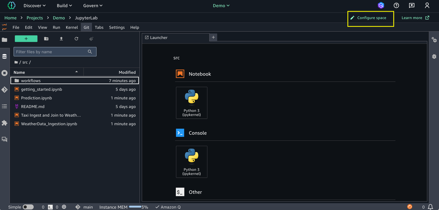 - Configure your SageMaker Unified Studio space: Spaces are used to manage the storage and resource needs of the relevant application. For this demo, configure the space with an ml.m5.8xlarge instance