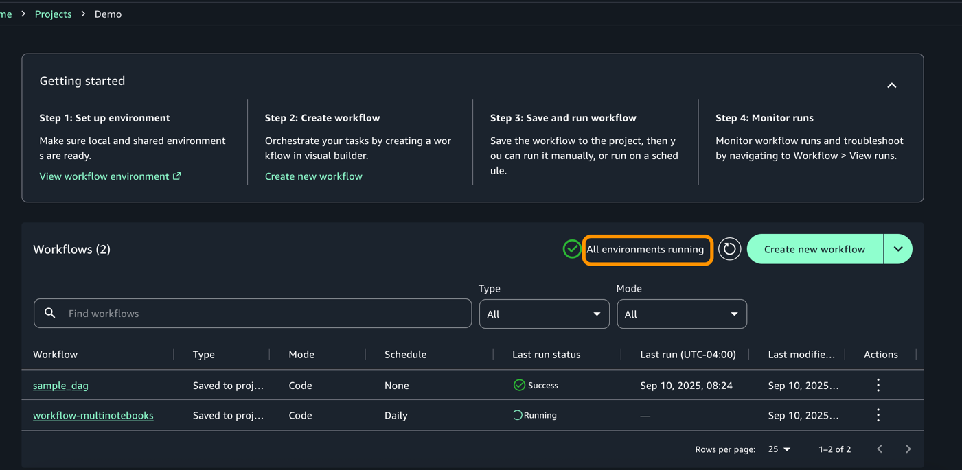 - After a workflow environment has been created by a project owner, and once you’ve saved your workflows DAG files in JupyterLab, they are automatically synced to the project. After the files are synced, all project members can view the workflows you have added in the workflow environment. See Share a code workflow with other project members in an Amazon SageMaker Unified Studio workflow environment.