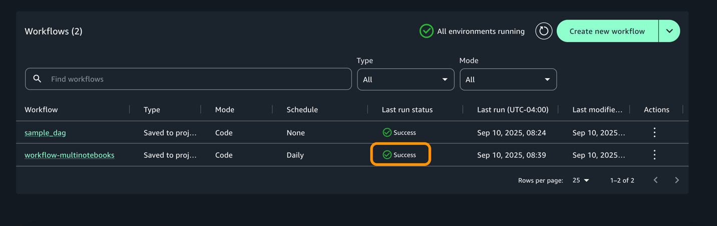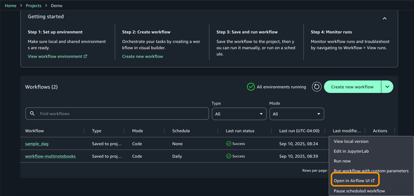 You can use workflows in SageMaker Unified Studio to set up and run a series of tasks using Apache Airflow to design data processing procedures and orchestrate your querybooks, notebooks, and jobs. You can create workflows in Python code, test and share them with your team, and access the Airflow UI directly from SageMaker Unified Studio. It provides features to view workflow details, including run results, task completions, and parameters. You can run workflows with default or custom parameters and monitor their progress. Now that you have your SageMaker Unified Studio project set up, you can build your workflows.