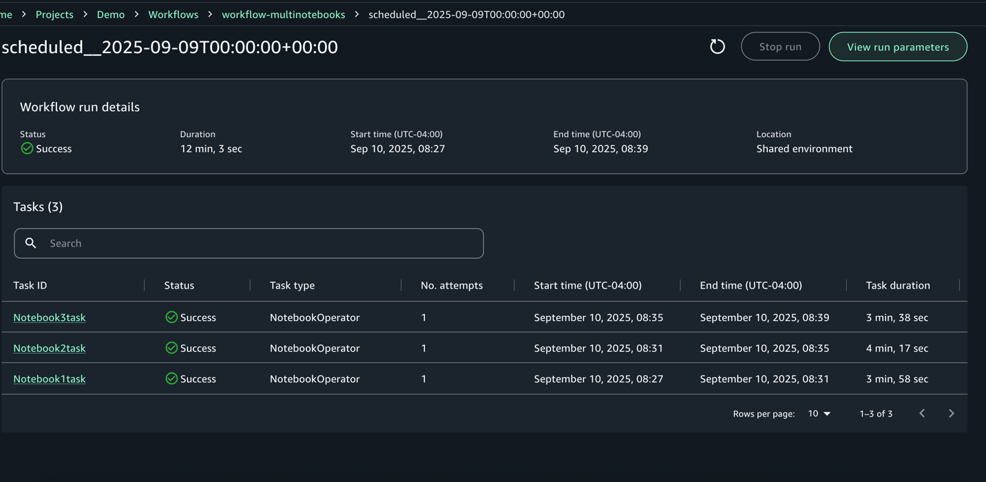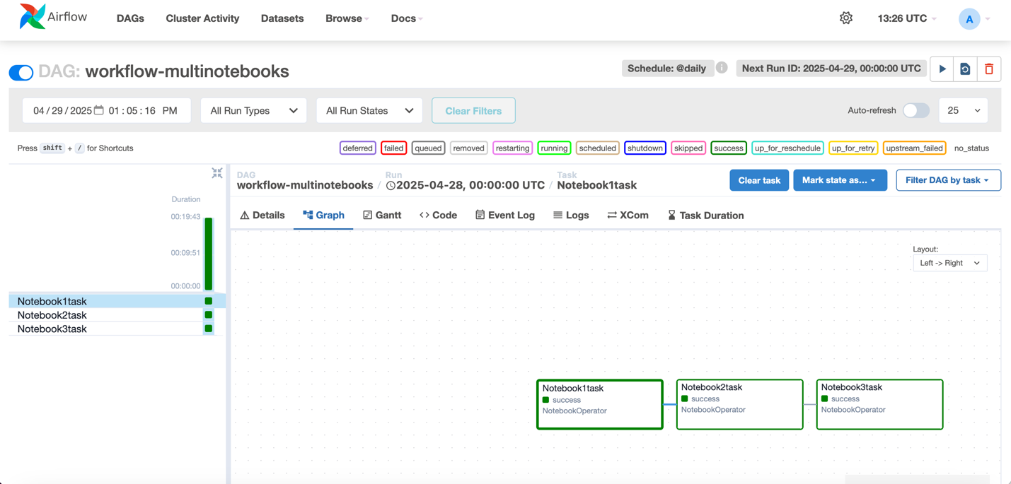 The code uses the NotebookOperator to execute three notebooks in order: data ingestion for weather data, data ingestion for taxi data, and the trained model created by combining the weather and taxi data. Each notebook runs as a separate task, with dependencies to help ensure that they execute in sequence. You can customize with your own notebooks. You can modify the NOTEBOOK_PATHS