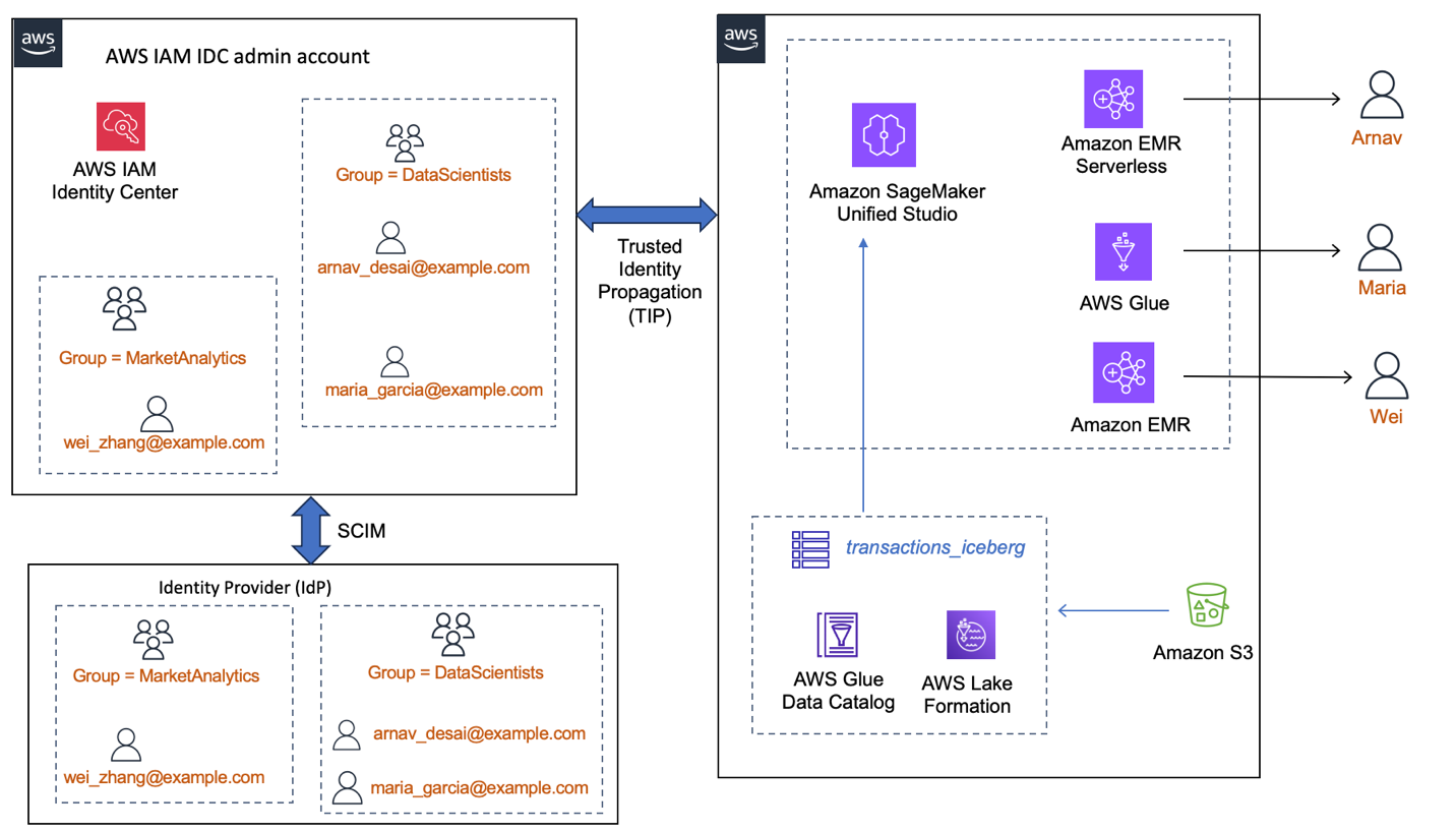 In our sample implementation, we show how to enable three different data scientists—Arnav, Maria, and Wei—belonging to two different teams, to access the same datasets, but with different levels of access. We use Lake Formation tags to grant column restricted access and have the three data scientists run their Spark sessions within the same SageMaker Unified Studio project. When the individual users sign in to the SageMaker Unified Studio project, their IDC user or group identity context is added to the SageMaker Unified Studio project execution role, and their fine-grained permissions from Lake Formation on the catalog tables are effective. We show how their data exploration is isolated and unique.