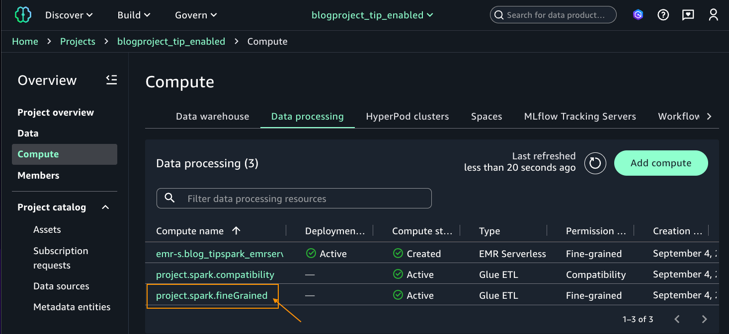 blogproject_tip_enabled. From the left navigation pane, choose Compute. On the Data processing tab, choose Add compute.
