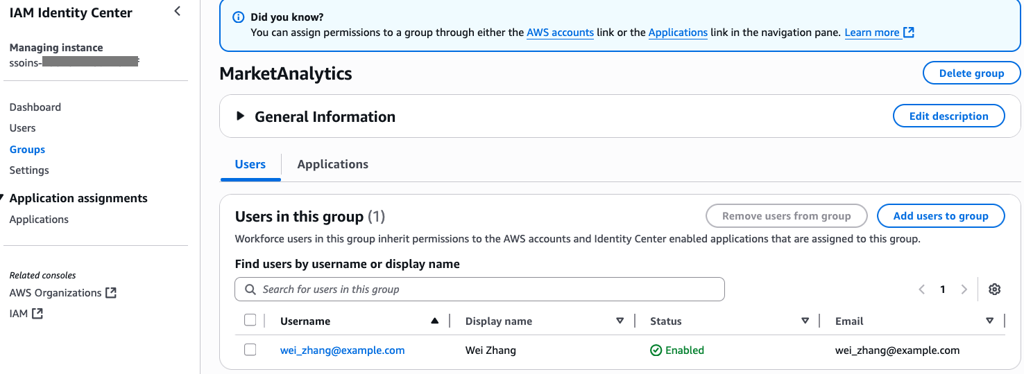 - Three IAM Identity Center users (Arnav, Maria, and Wei) and two groups (DataScientists and MarketAnalytics). For instructions on creating IAM Identity Center users, refer to Add users to your Identity Center directory. For instructions on creating groups, refer to Add groups to your Identity Center directory.