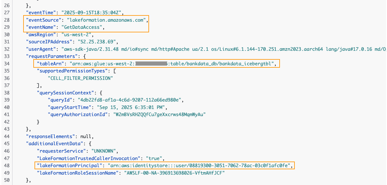 You can trace the user access of the table in the CloudTrail logs for EventName=GetDataAccess. In the relevant CloudTrail log shown below, we notice that the UserID for Wei is provided under additionalEventData field, whereas requestParameters has the tableARN.