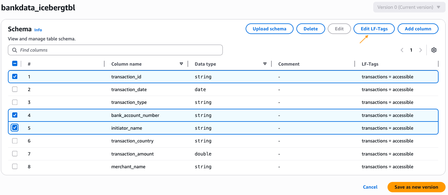 bankdata_icebergtbland verify that the LF-Tagtransactions=accessibleis inherited by the table. - Edit the schema of the table and change the LF-Tag value on the columns