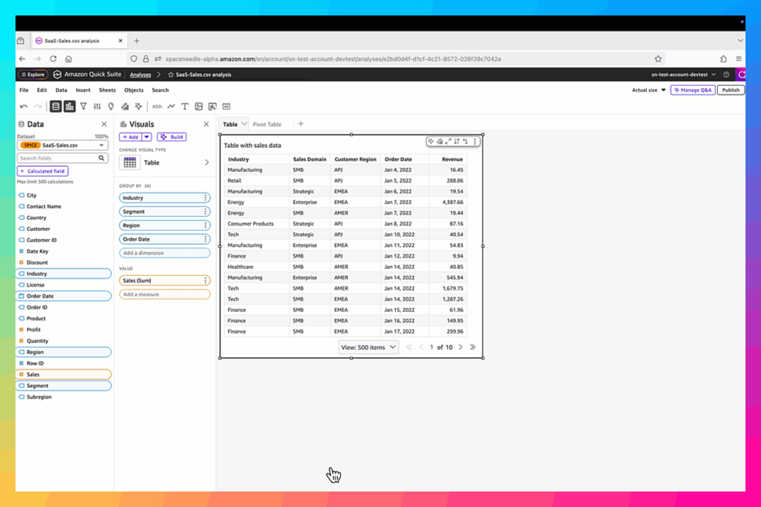 For our example, the author created a table visual with a default view that includes the dimensions Industry, Sales Domain, Customer Region, and Order Date, as well as the measure Revenue.