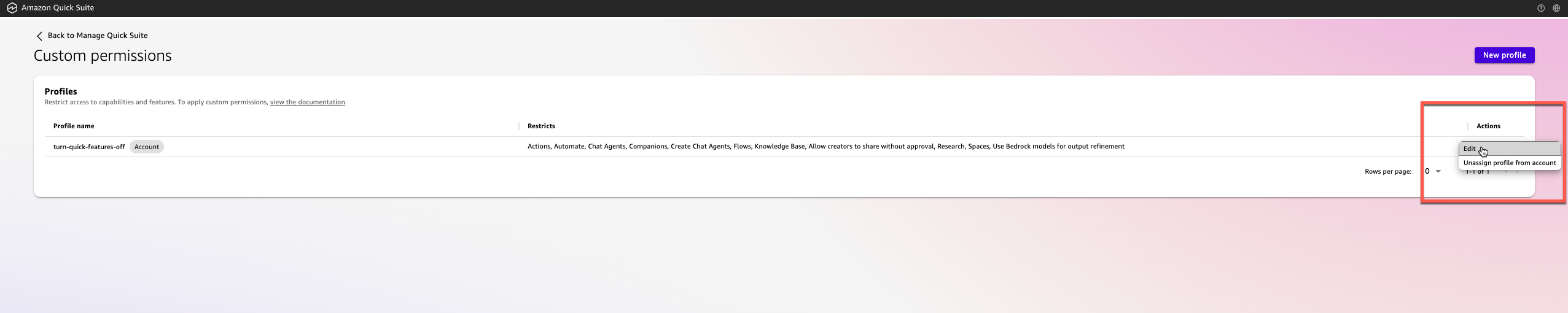 Properly configuring custom permissions can help you achieve enhanced security posture, regulatory compliance, and operational confidence as your organization scales its use of the advanced capabilities of Quick Suite. For more details, refer to Creating a custom permissions profile in Amazon Quick Suite.