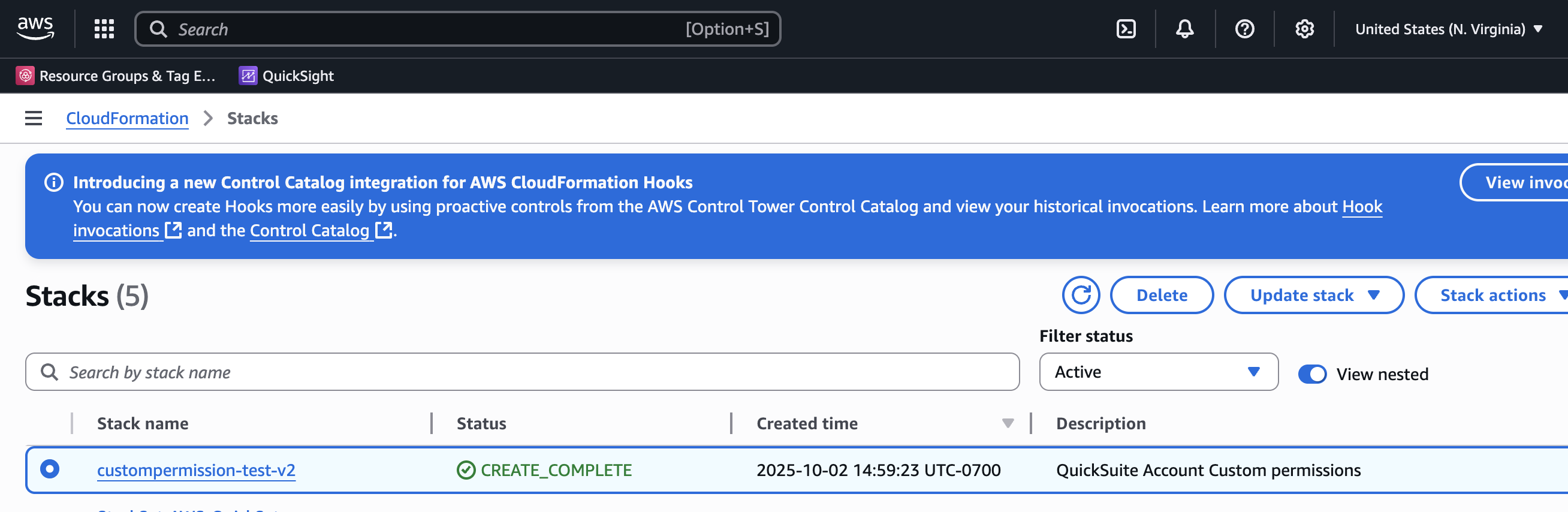The CloudFormation template creates the necessary resources in your AWS account. After you deploy the stack, the Lambda function orchestrating the creation and assignment of custom permissions at the account level through public Quick APIs is automatically triggered. The specific custom permission created through this code will disable the new Quick Suite AI capabilities at the account level.