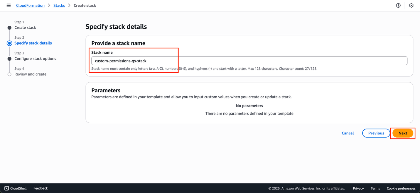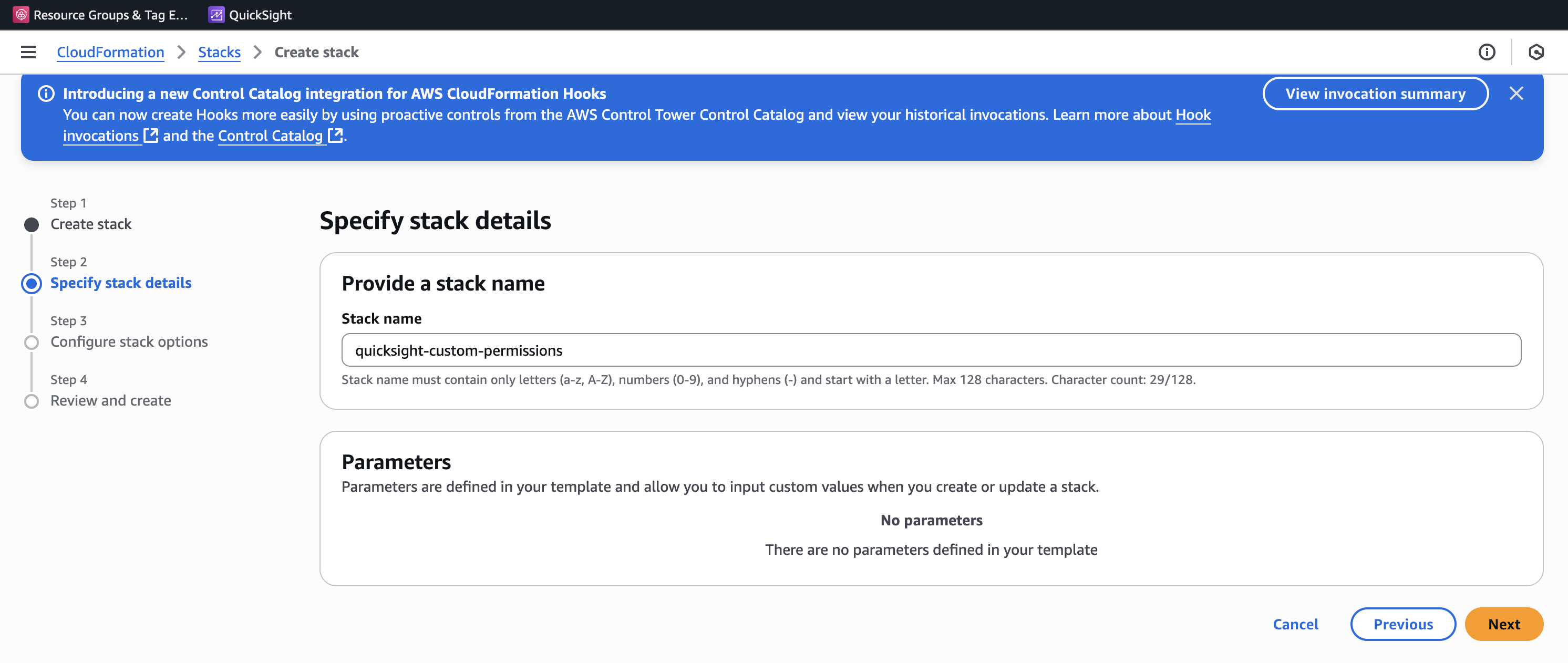 - Choose Launch Stack to provision the necessary resources to automatically apply account-level custom permissions: