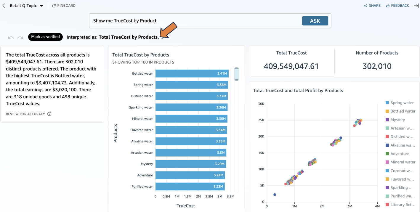 After you create the calculated field, you can immediately incorporate it into your natural language queries. For example, when asking “Show me TrueCost by Product,” the system automatically applies the calculation and displays precise cost metrics for each product.
