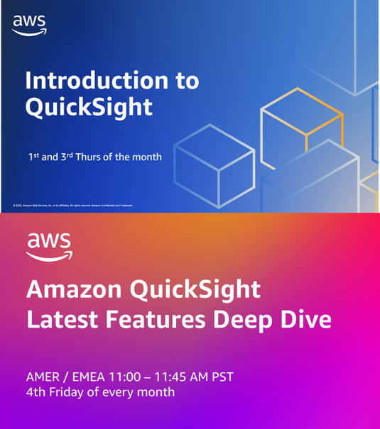 Check out our QuickSight events calendar for a chronological order of these sessions.