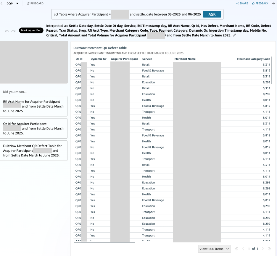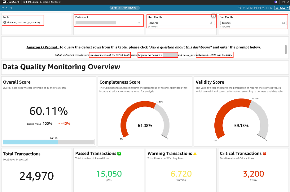 Perhaps our most innovative implementation is the Data Quality Monitoring dashboard, which uses the generative AI capabilities of Amazon Q. This dashboard, shown in the following image, goes beyond traditional visualization by enabling dynamic defect reporting for participating banks. Users can select specific parameters and generate detailed defect records through natural language queries, significantly streamlining the process of identifying and communicating data quality issues to our banking partners.