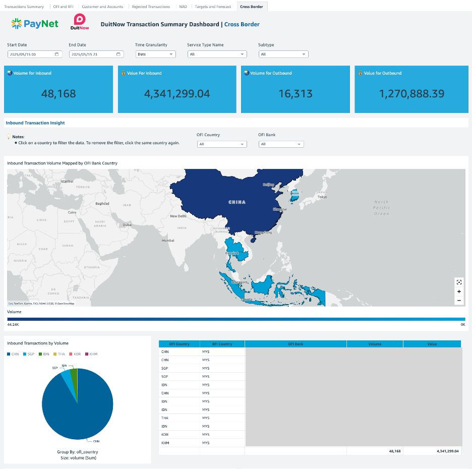 The Cross-Border tab, shown in the following figure, represents another key implementation, offering comprehensive insights into international payment flows. It visualizes both inbound and outbound transaction volumes and amounts, helping us identify trends and opportunities in our international corridors. This visibility has proven invaluable as we continue to expand our cross-border payment services.