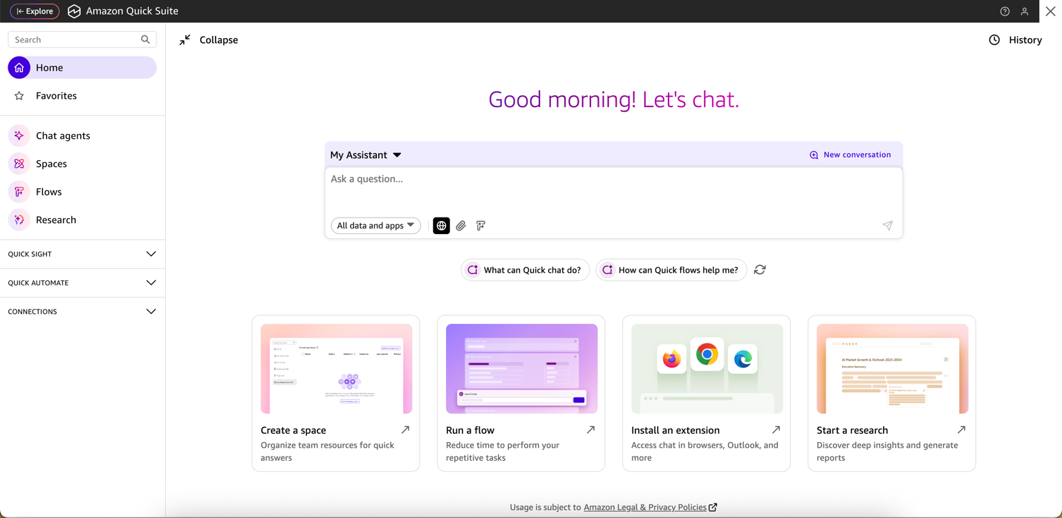 Your entire QuickSight environment, including dashboards, datasets, and analyses, remains unchanged. All data connectivity, security controls, and user permissions continue unchanged. Your existing API integrations keep working as before, and no data migration is required. Importantly, existing compliance certifications and attestations, including SOC, HIPAA, ISO 27001, ISO 27019, ISO 27018, ISO 9001, GDPR, and FedRAMP, remain valid and in effect. Quick Suite will inherit existing compliance postures of QuickSight. We also want to emphasize the AWS commitment to data privacy and security. We do not use customer content to train our models, and we haven’t introduced any new model providers. Your data remains yours, with the same enterprise-grade security and governance controls you trust. This seamless transition means you can adopt new capabilities at your own pace while maintaining business continuity