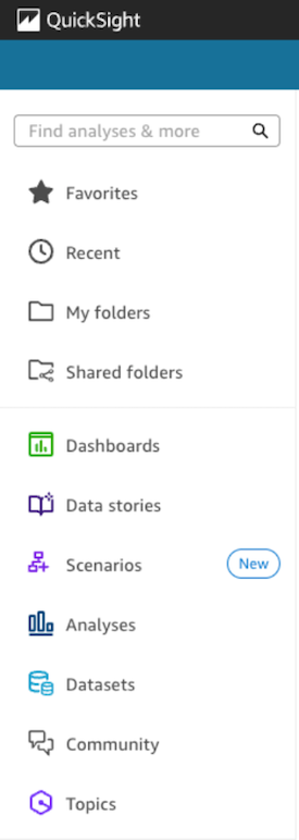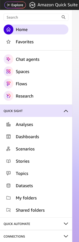 Familiar BI features are now organized under Quick Sight in the navigation pane: My folders and Shared folders for organized content access, Dashboards, Stories (formerly Data Stories), Analyses, and Datasets. Favorites remain at the top level for quick access, global search is now located in the top left corner, and Quick Research, Quick Flows, Quick Automate, and Connections are accessible through dedicated sections in the navigation pane.
