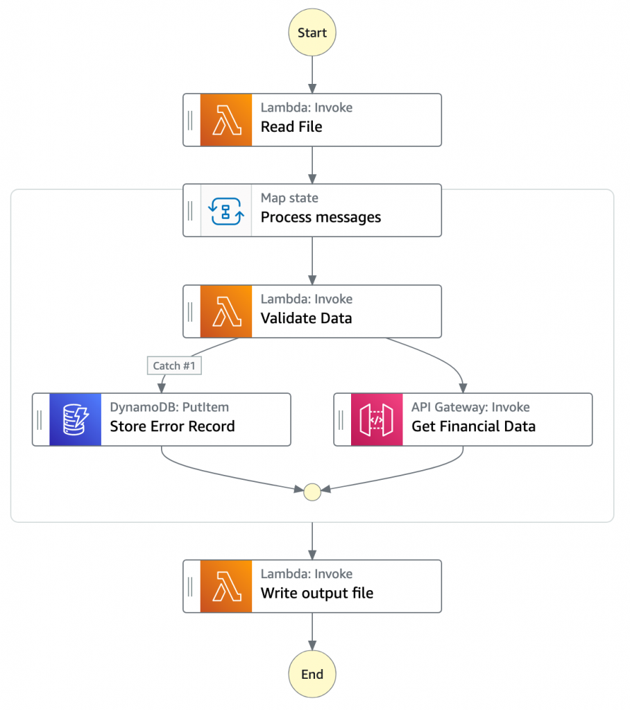 - The next state Get Financial Data invokes Amazon API Gateway endpoints to enrich the data in the file with data from a DynamoDB table.