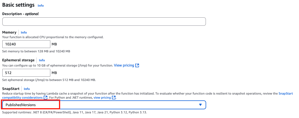 To learn more about Lambda, refer to our documentation. For details about Lambda SnapStart, refer to our launch posts for Java, Python and .Net, and the documentation.