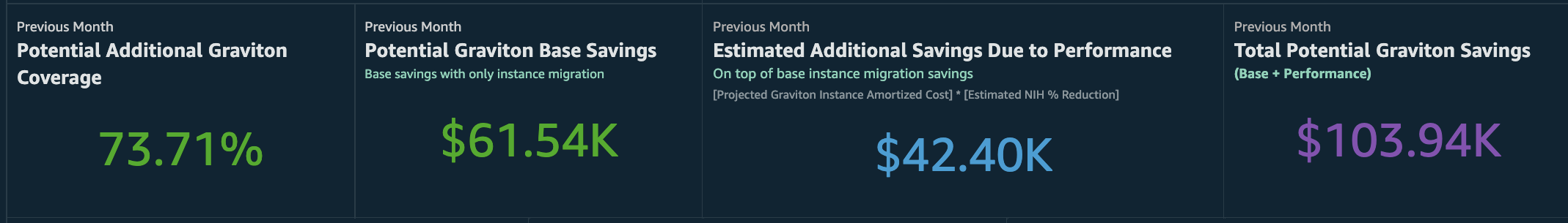 The dashboard now features a new slider that lets you model potential cost savings by inputting the percentage reduction in NIH. Many organizations have found it challenging to calculate their total possible savings since the benefits come from two sources: the lower instance pricing of AWS Graviton and the reduced compute hours.