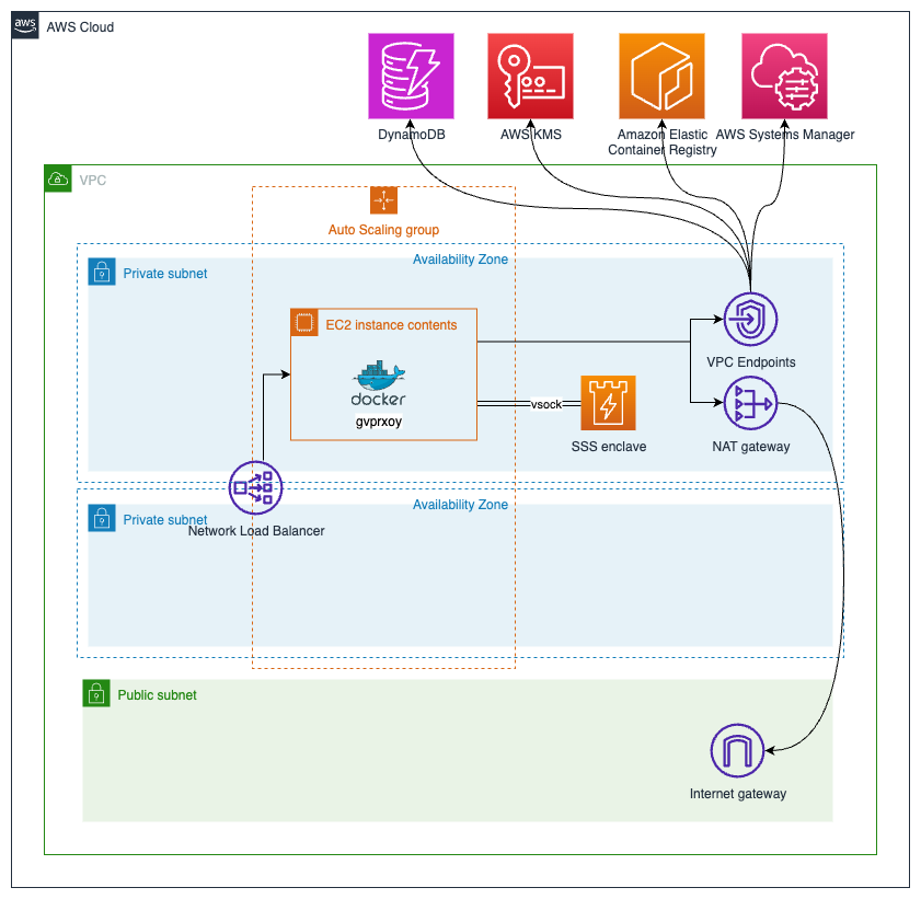 - EC2 instances are placed in several private subnets and in different Availability Zones (AZ) using the auto-scaling group (ASG) to provide high availability. Network Load Balancer (NLB) is used to distribute the requests between different EC2 instances in the ASG. Each EC2 instance has one AWS Nitro enclave associated.