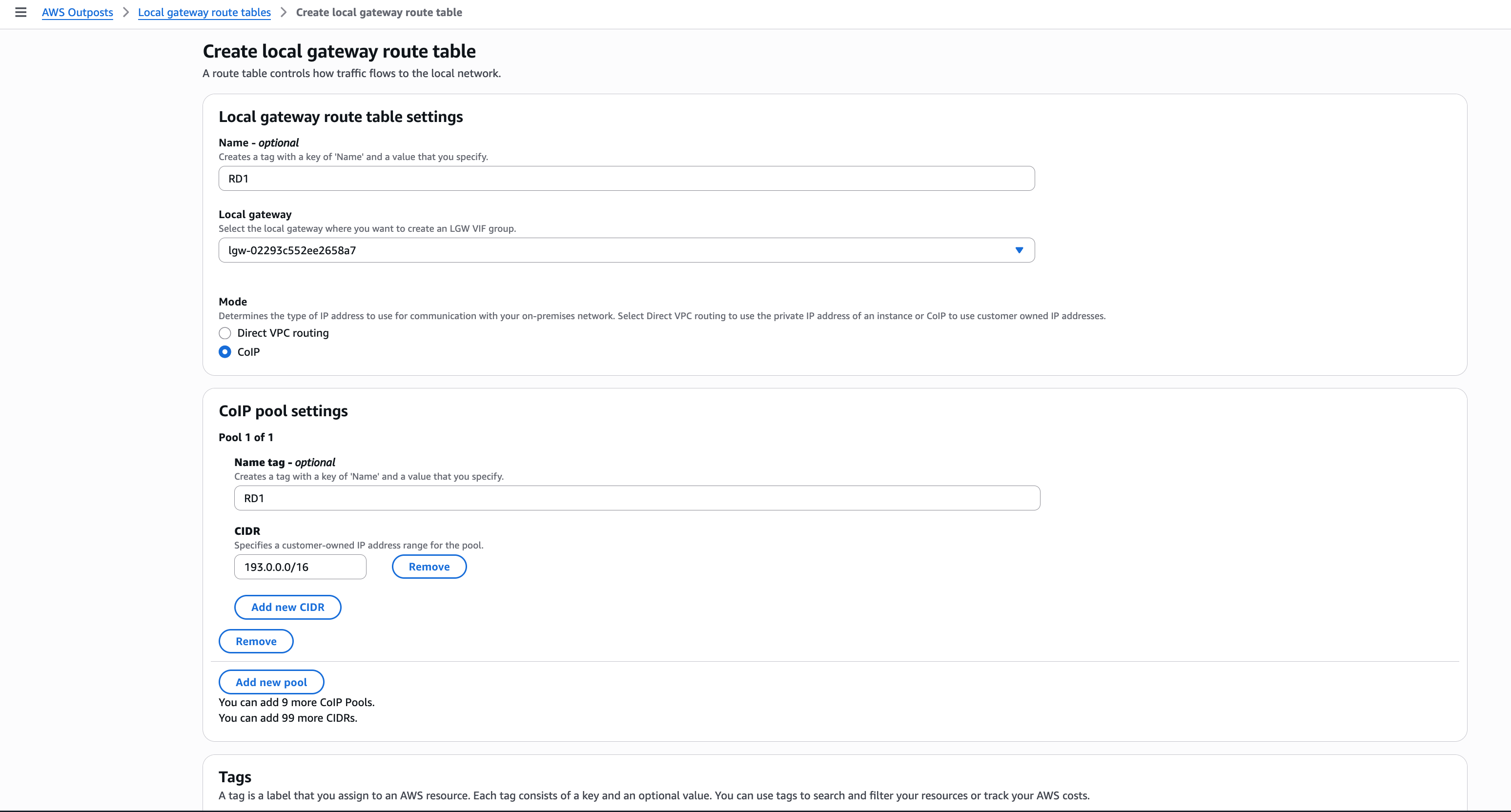 Figure 3 – Creating LGW route table for RD1 routing domain