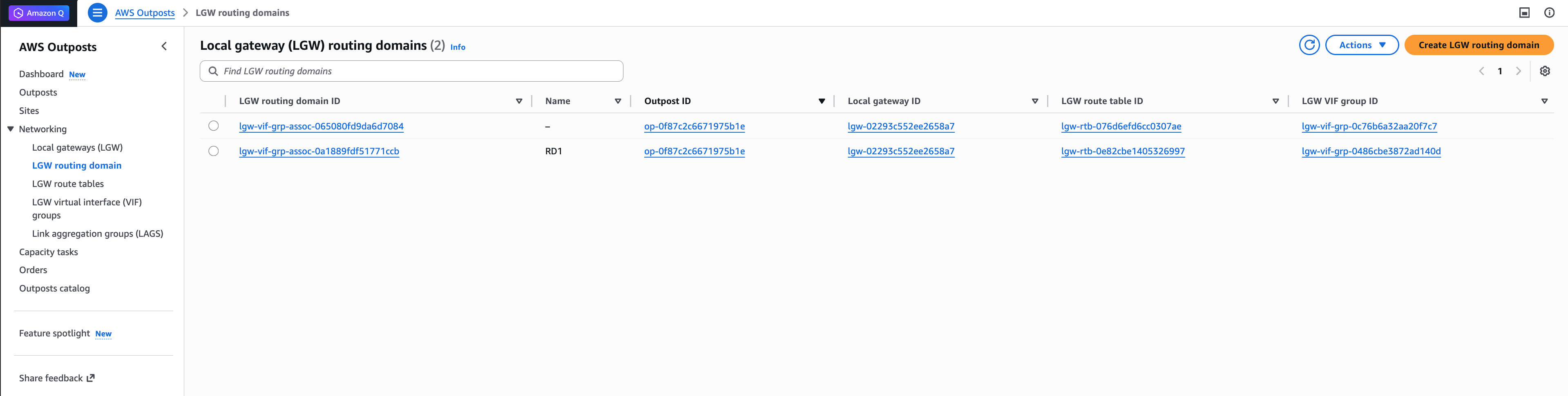 Before creating a LGW routing domain, first you’ll need to create an LGW VIF group and an LGW route table. A local gateway routing domain is the association of a local gateway route table and local gateway VIF group. Each VIF group can be associated with one or more VLANs, but a route table can only be associated with one VIF group.