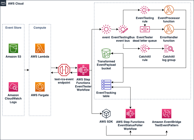 - This request is validated and routed to a Step Functions EventTester workflow, which performs the event test.
