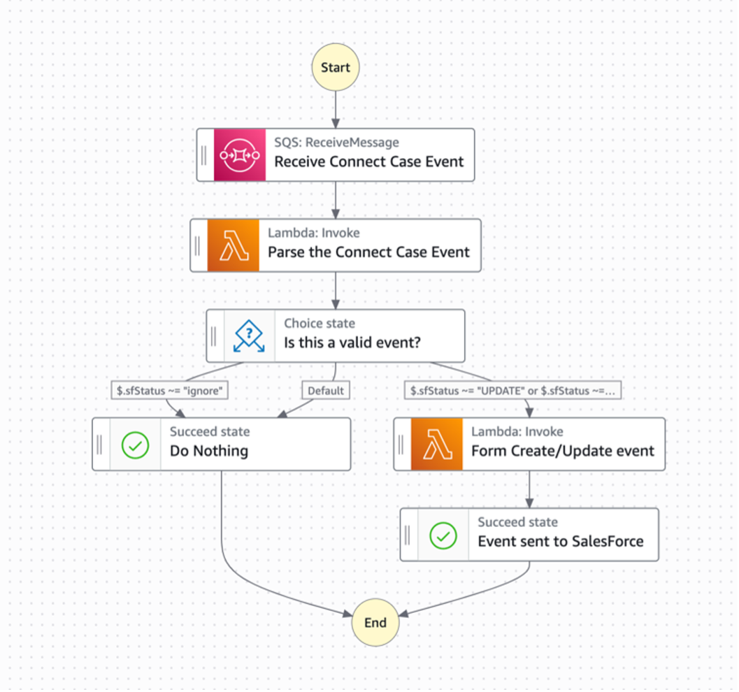 The following image depicts an AWS Step Functions workflow that receives Amazon Connect case events via SQS, parses them with Lambda, validates the event status, and either ignores invalid events or forms and sends create/update events to Salesforce.