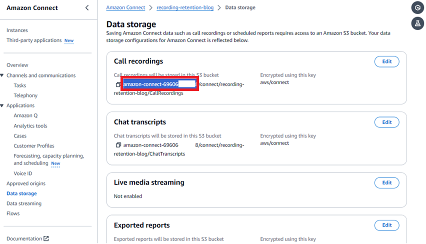 c. Access the Data storage section of the navigation from the Amazon Connect service page of the AWS Management Console. You can identify the name of the S3 bucket here. While the full path is provided, you just need the bucket name.
