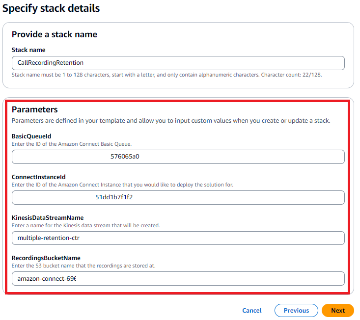 You will be greeted by a form from the CloudFormation service. Provide the Stack name with a descriptive name. These parameters align the template to your specific Amazon Connect instance and recordings bucket.