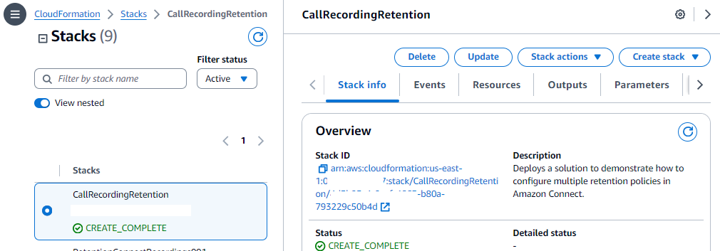 Navigate to the CloudFormation template deployed as part of this blog, and delete the stack. This step should successfully delete the IAM, Lambda, and Kinesis Data Streams resources. The only exception to this should be the example Contact Flow, which we will tackle in the next step.