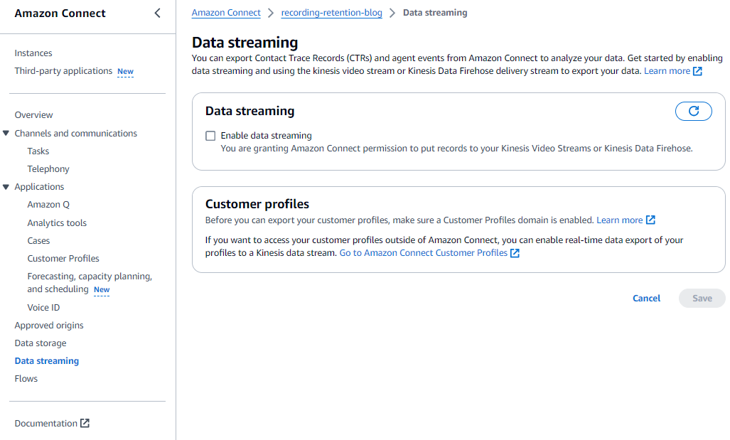 a. Access the Data streaming section of the navigation from the Amazon Connect service page of the AWS Management Console. Notice whether Data streaming is enabled.