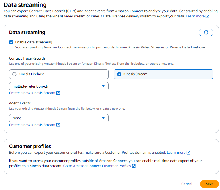 The Amazon Connect Instance should be configured to send Contact Trace Records (CTR) data to the “multiple-retention-ctr” Kinesis Data Stream. This can be achieved by visiting the “Data streaming” section of the Amazon Connect Instance configuration screen in the AWS Management Console.