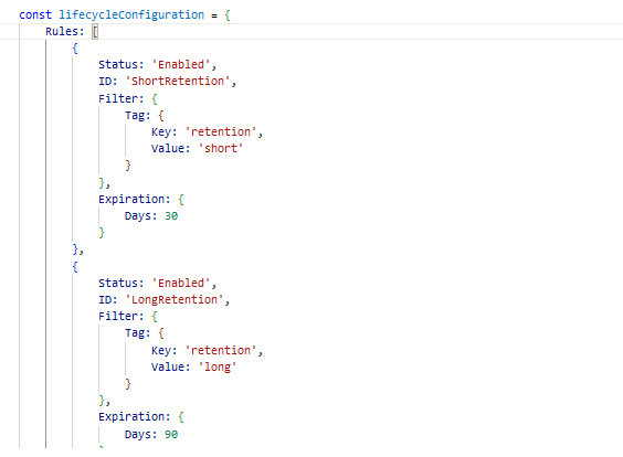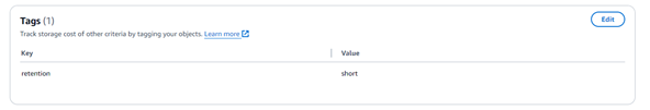 This code extracts the value of the `retention’ attribute and creates a tag with key ‘retention’ and value obtained from ‘retentionvalue’, applies the tag to the Amazon S3 Object using ‘PutObjectTagging’ API.