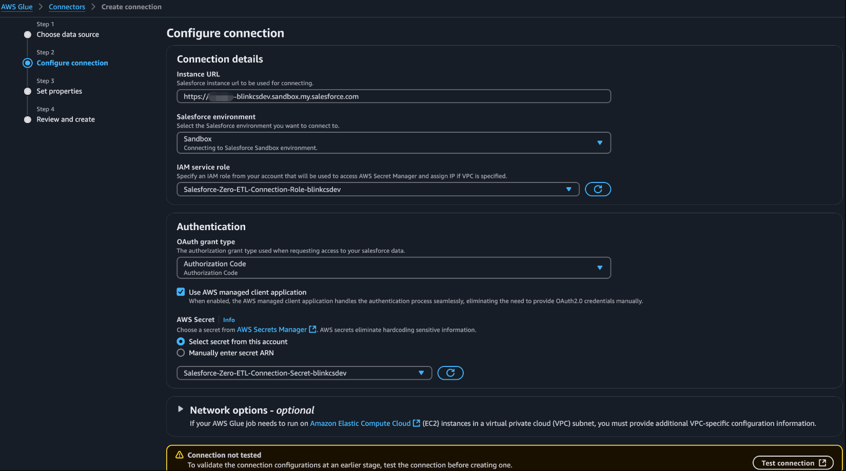 Figure 4: AWS Glue console showing detailed configuration steps for creating a Salesforce source connection, including required authentication and IAM role settings
