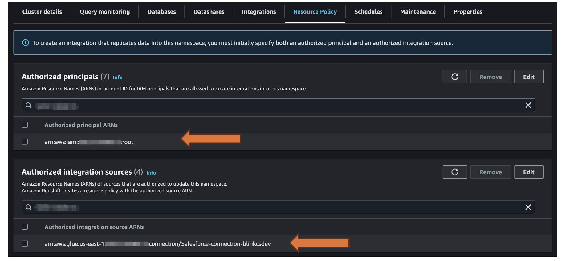 Figure 7: Resource-based policy configuration for Amazon Redshift showing required permissions for AWS Glue Zero ETL integration and data publishing.