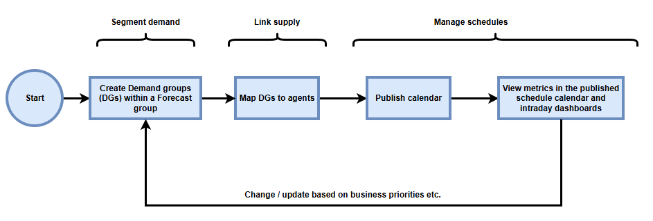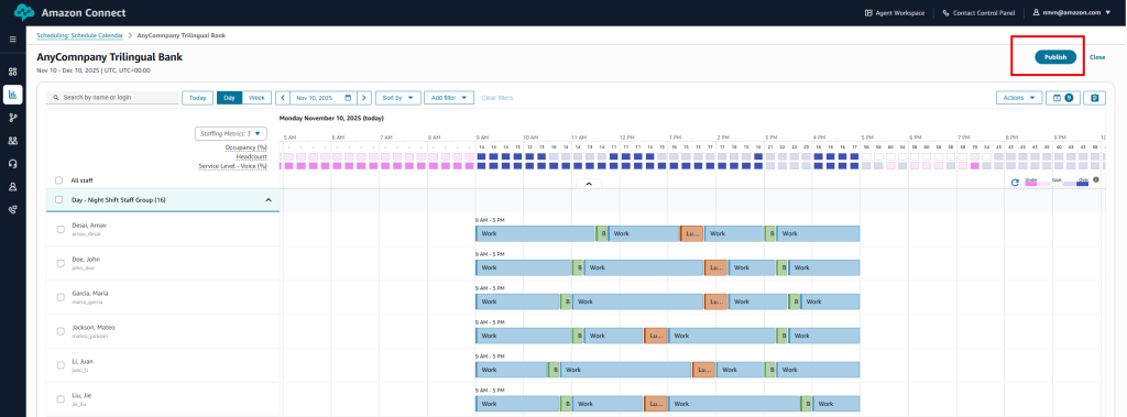 Manage schedule: We will leverage the demand forecast and the staffing group setup above to then generate and publish a calendar based on agent skills. Metrics viewed in the calendar can help with intraday administration and help drive the decision for future changes.