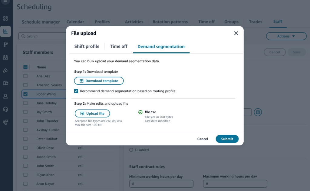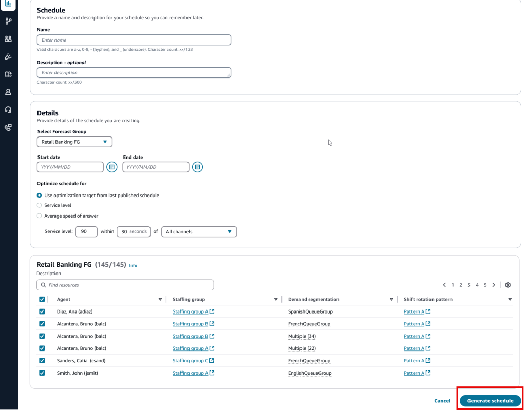 Amazon Connect FCS generates a draft schedule that is hidden from agents until it is published. Schedulers can address warnings or failures and regenerate the draft schedule iteratively, before publishing the final version (see details here). The schedule comprises multiple agent shifts, which include designated work periods and breaks. Amazon Connect independently calculates the required agent headcount for each demand group using forecasted contact volumes, then creates agent shifts according to demand group assignments.