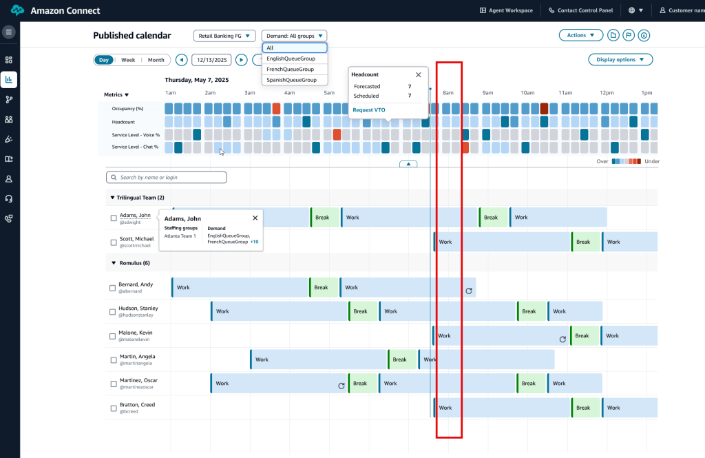 Note: In this example, when French language demand peaks at 8:00am, requiring eight agents for the FrenchQueueGroup, Amazon Connect Scheduling assigned eight agents (from the trilingual group and six from the Romulus staffing group) to handle French language queues, providing optimal staffing allocation during peak periods (see FIG 13 below).