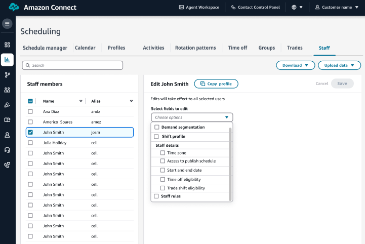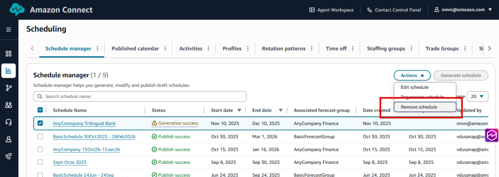 Console setup: Currently, schedule generation requires a published forecast. Before generating your schedules, establish your shift structure, which comprises shift activities, shift profiles, and shift rotation patterns. Shift activities encompass productive work (such as customer contact handling), non-productive tasks (including breaks and team meetings), and time off. Shift profiles allow you to create constraints that apply to schedules, such as working hours and number of shifts per week. You can create multiple shift profiles to accommodate teams across different time zones. You can also create shift rotation patterns to rotate agents through various shift profiles over extended periods. Please refer this page for detailed instructions on how to generate a schedule.