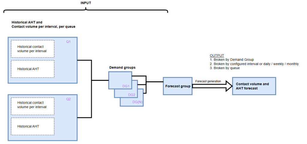 - Demand groups (DG): Distinct subsets of work within forecast groups that represent specific workloads requiring specialized agent skills. Each demand group is independently forecasted and mapped to specific queues.