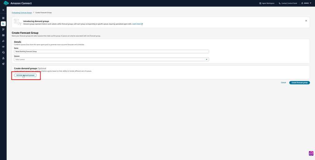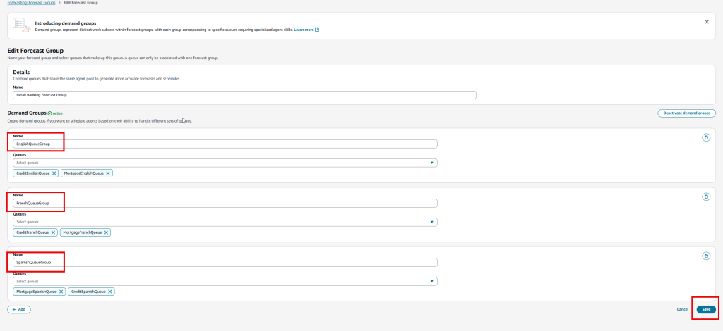 Context: To forecast future demand for which agents need to be scheduled, forecasters can create Forecast Groups that aggregate all the demand within a specific line of business. When creating a forecast group, forecasters now have a new option to “create demand groups”. This feature enables multi-skilling capabilities. Our build assumes that the following queues have been created within Amazon Connect (see here on how to create queues in Amazon Connect), and have been servicing contacts for the past six-to-eight months.