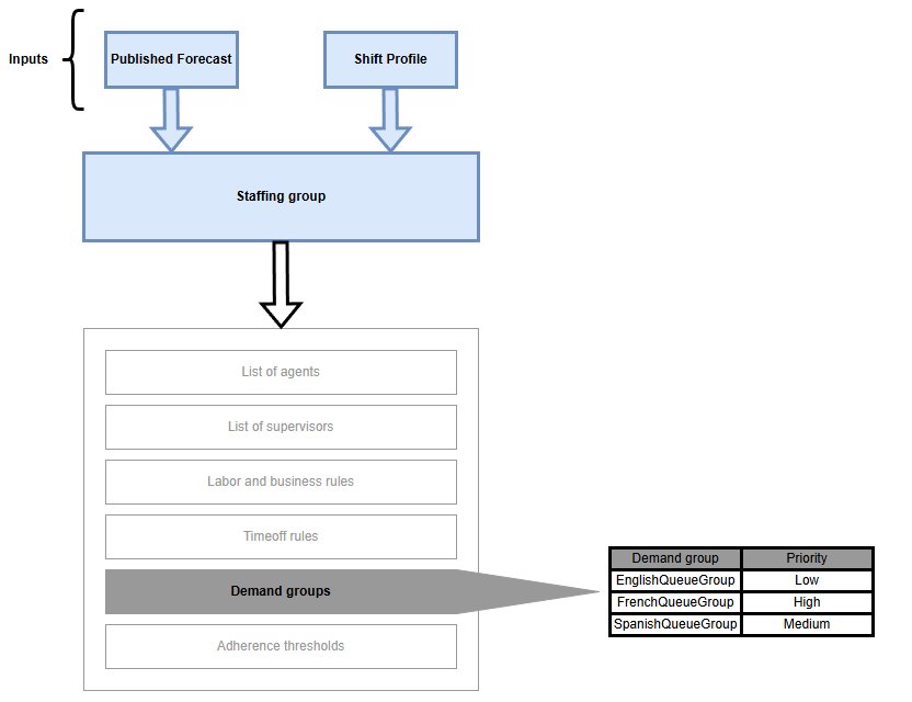 A staffing group can only be assigned to a single forecast group, but it can be associated with multiple demand groups within it. FIG 7 illustrates this.