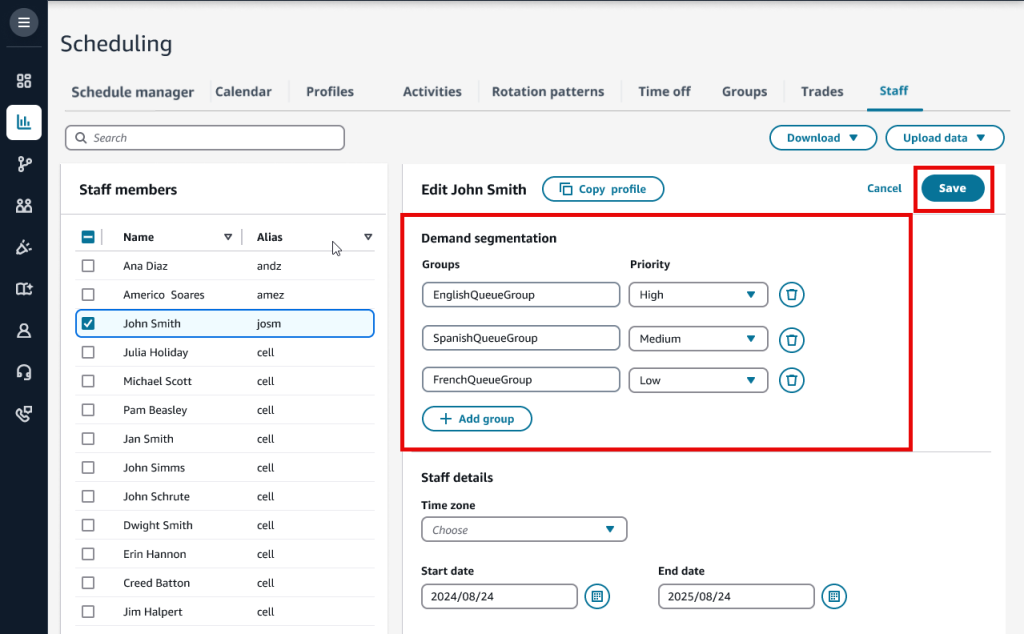 - Staffing groups: Teams of agents organized by their skill sets, with priority assignments for different demand groups. NOTE: Staffing groups already exist within Amazon Connect (see here for details). They have been updated as part of this capability and hence, are noted here for continuity.