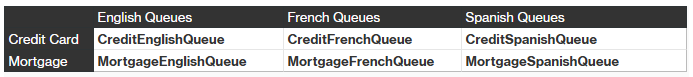 Context: Continuing with our Mortgage and Credit Card examples, consider a team of English, Spanish and French skilled agents who need to be staffed, as classified in TABLE 2 below: