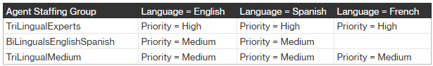 You can specify the priority levels for each of the demand groups. A high priority indicates that these agents are best suited (or most skilled) for the corresponding demand group. For this example, let us assume that the agents in the TrilingualExpertTeam are most fluent in French, followed by Spanish, and then English.