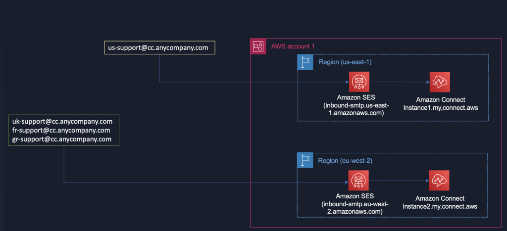 Let’s consider a global fictitious enterprise organization, AnyCompany, implementing Amazon Connect to enable an omnichannel experience for their customers. AnyCompany has implemented two Amazon Connect instances: one in the US East (us-east-1) region for US customers, and another in the EU West (eu-west-2) region in London for European customers. They aim to route emails as follows: