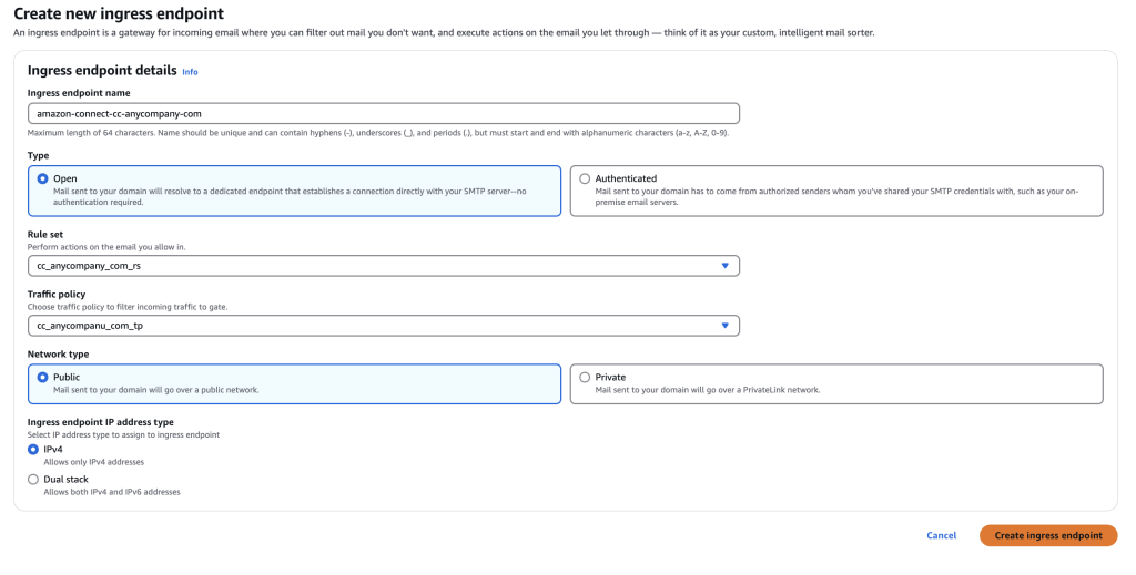 Step 4: Create an ingress endpoint. Navigate to Amazon SES console page, Mail manager, Ingress endpoints and click on Create ingress endpoint.