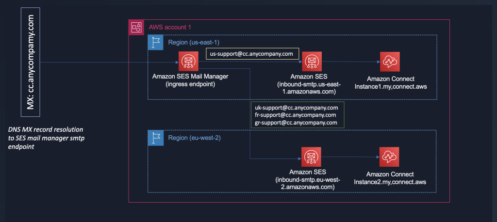 Global enterprises often design their customer service architecture using multiple Amazon Connect instances across regions – for example, using US region instances for US customers and EU region instances for EU customers. These organizations frequently need to route emails from a single domain to different regional Amazon Connect instances. This blog post demonstrates how Amazon SES Mail Manager provides an effective solution for routing emails to multiple Amazon Connect instances based on email recipients. Organizations using Amazon Connect often need to configure their DNS (Domain Name System) MX (Mail eXchange) records to route emails to Amazon SES endpoints. This blog post shows how Amazon SES Mail Manager enables routing from a single domain to multiple Amazon Connect instances, allowing organizations to implement region-specific email handling for their global customer base.